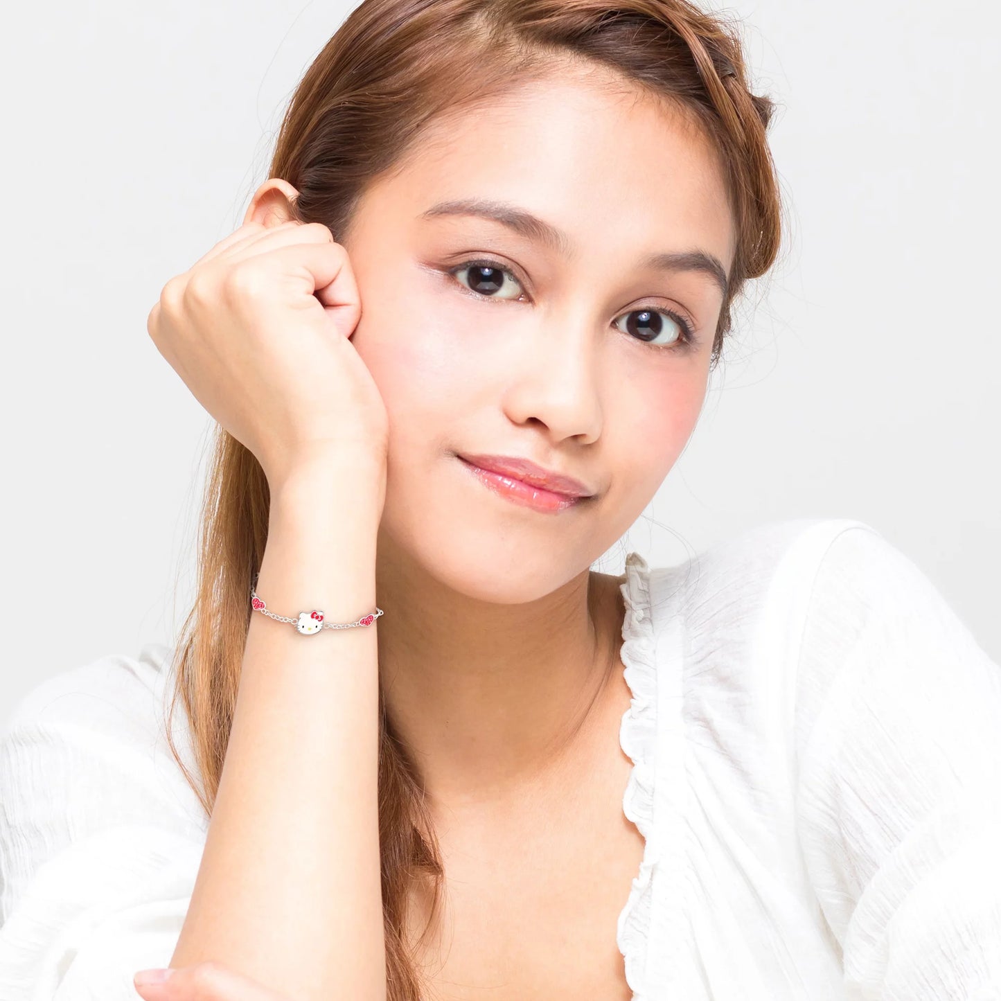 - Wear your love for Hello Kitty on your wrist. This silver bracelet features a white and yellow enamel Hello Kitty pendant with a red enamel bow. Four stationary red hearts with sparkly embellishments also encircle the bracelet